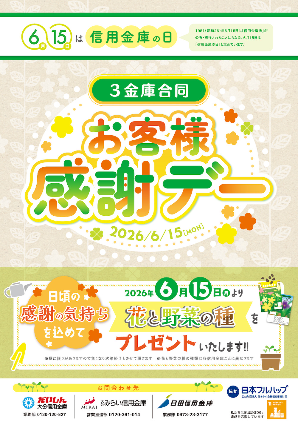 令和8年6月15日(月)の「信用金庫の日」に日頃の感謝の気持ちを込めて、大分県内の3信用金庫(大分信用金庫・大分みらい信用金庫・日田信用金庫)の店頭で、花と野菜の種の無料配布を行います。私共がともに歩むこの地域が花と緑でいっぱいになり、更に住みやすい街となっていくことを祈念しております。