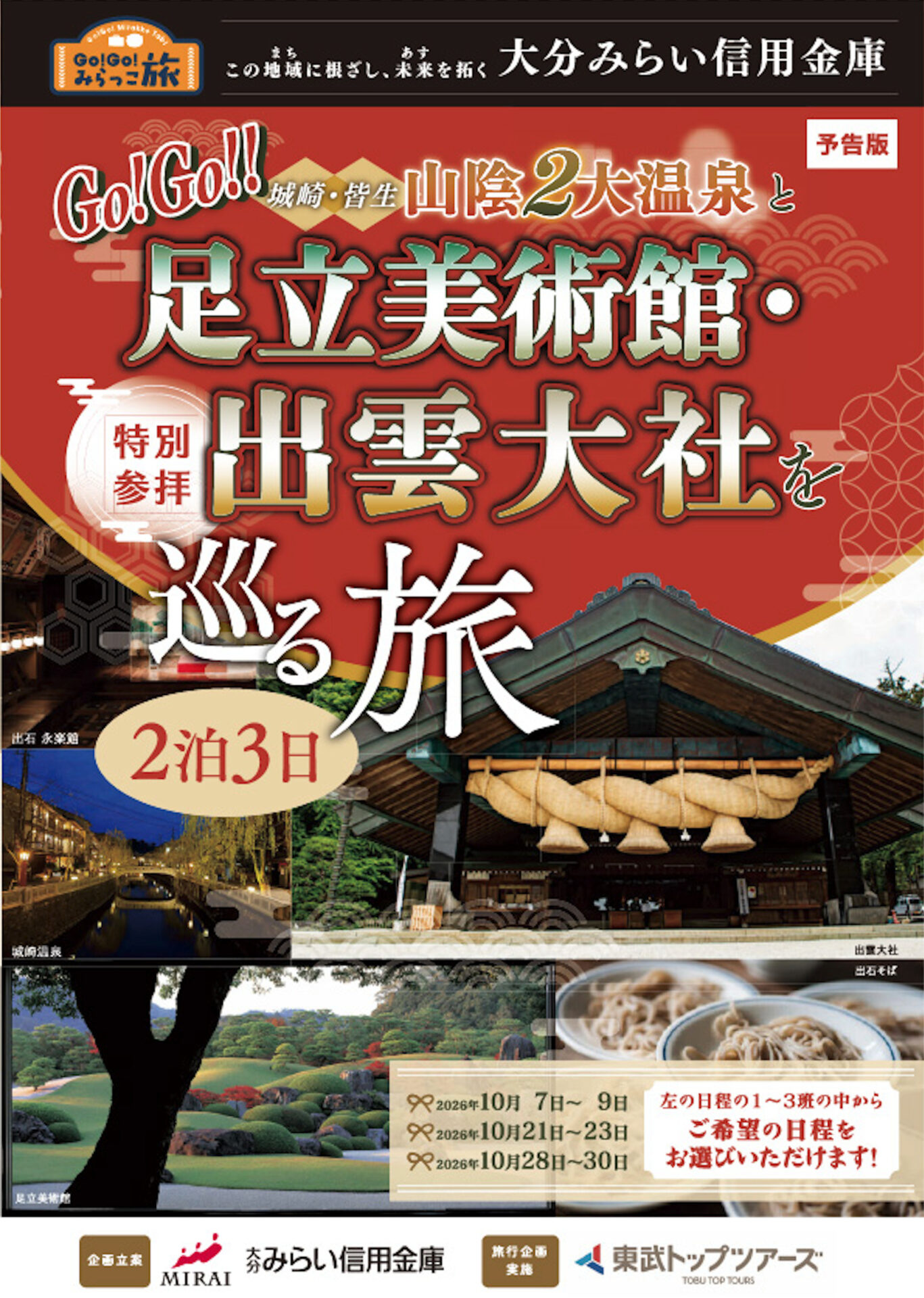 大分みらい信用金庫(理事長森田展弘)は、前回ご好評をいただきました北海道「道東地区」を巡る旅に続き、但馬信用金庫(兵庫県)さま、米子信用金庫(鳥取県)さまのご協力をいただき、「城崎・皆生山陰二大温泉と足立美術館・出雲大社を巡る旅」を企画いたしました。
