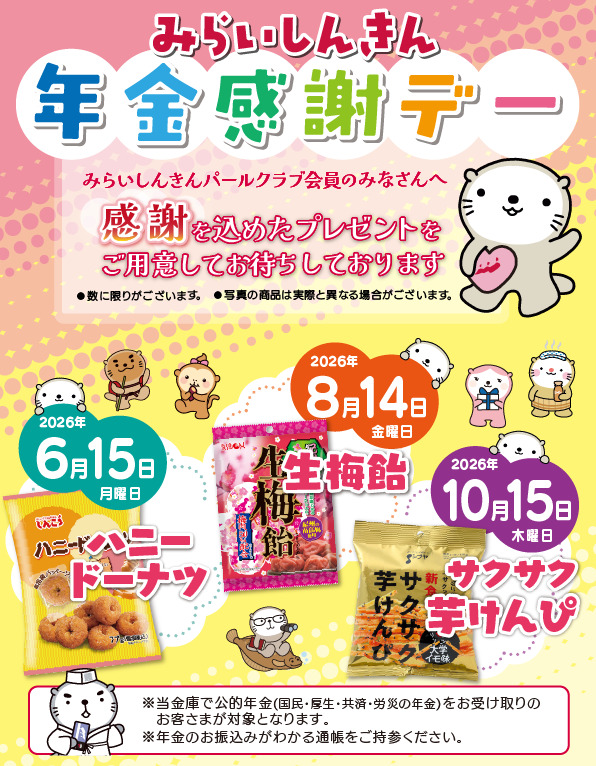 イベント・セミナー 2026年04月14日 年金感謝デー 開催日2026年 6月15日(月)2026年 8月14日(金)2026年10月15日(木) 開催場所全店舗(出張所、みらいハートプラザを含む) 内容 みらいしんきんパールクラブ会員の皆さま(当金庫で公的年金【国民・厚生・共済・労災】の年金をお受け取りのお客さま)へ日頃のご愛顧に感謝を込めたプレゼントをご用意してお待ちしております。※年金のお振込みがわかる通帳をご持参ください。※プレゼントは数に限りがあります。配布はなくなり次第終了となります。