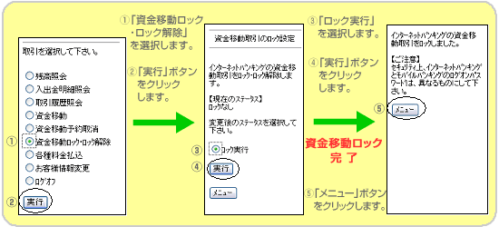 「資金移動ロック・ロック解除」でロックできる内容は次のお取引です。 ・資金移動(お振込/お振替) ・税金・各種料金の払込み