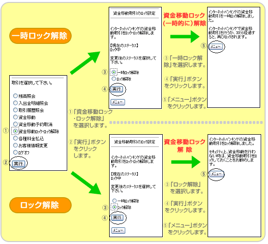 ※連続してお取引を行う場合はその都度「一時ロック解除」を実行する必要がございます。 ■ロック解除 「ロック解除」を選択された場合は、資金移動(お振込/お振替)および税金・各種料金の払込み完了後、および30分経過しても自動的にはロック状態に戻りません。 ロック状態に戻される場合は、お客様にて再度携帯電話から「ロック実行」を行いロック状態に戻す必要がございます。