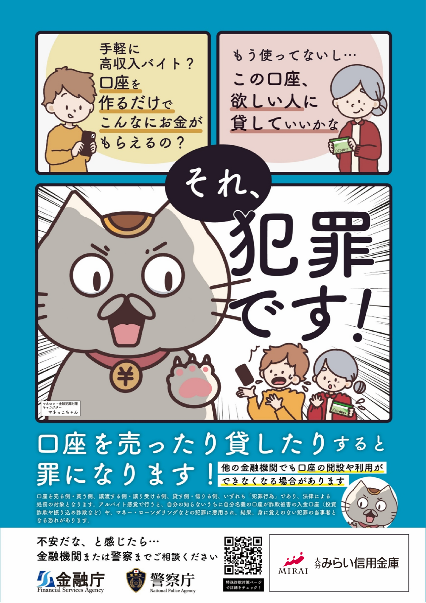 重要なお知らせ 2026年01月08日 口座の売買・譲渡・レンタルは犯罪です 口座の売買・譲渡・レンタルは犯罪です。振り込め詐欺等の犯罪に悪用されていることが判明した場合は、預金規定に則り、口座利用停止や解約等の措置をとり、法令に基づき行政庁へ届出いたします。