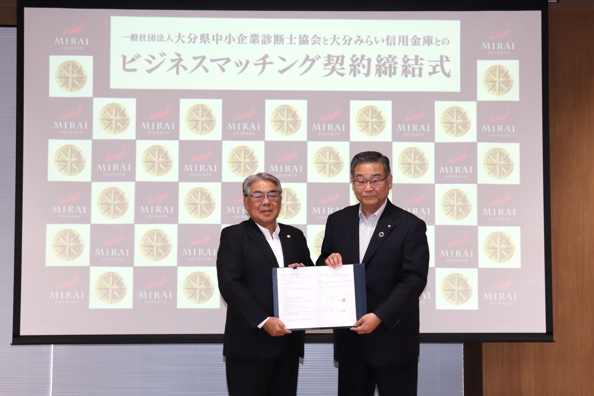 大分みらい信用金庫(理事長 森田展弘)は、取引先事業者が抱える経営課題・事業課題に対する助言や診断業務などを通じて、本業支援を実現するために、一般社団法人大分県中小企業診断士協会(代表理事 渡部智弘)とのビジネスマッチング契約を、下記のとおり締結しましたのでお知らせします。