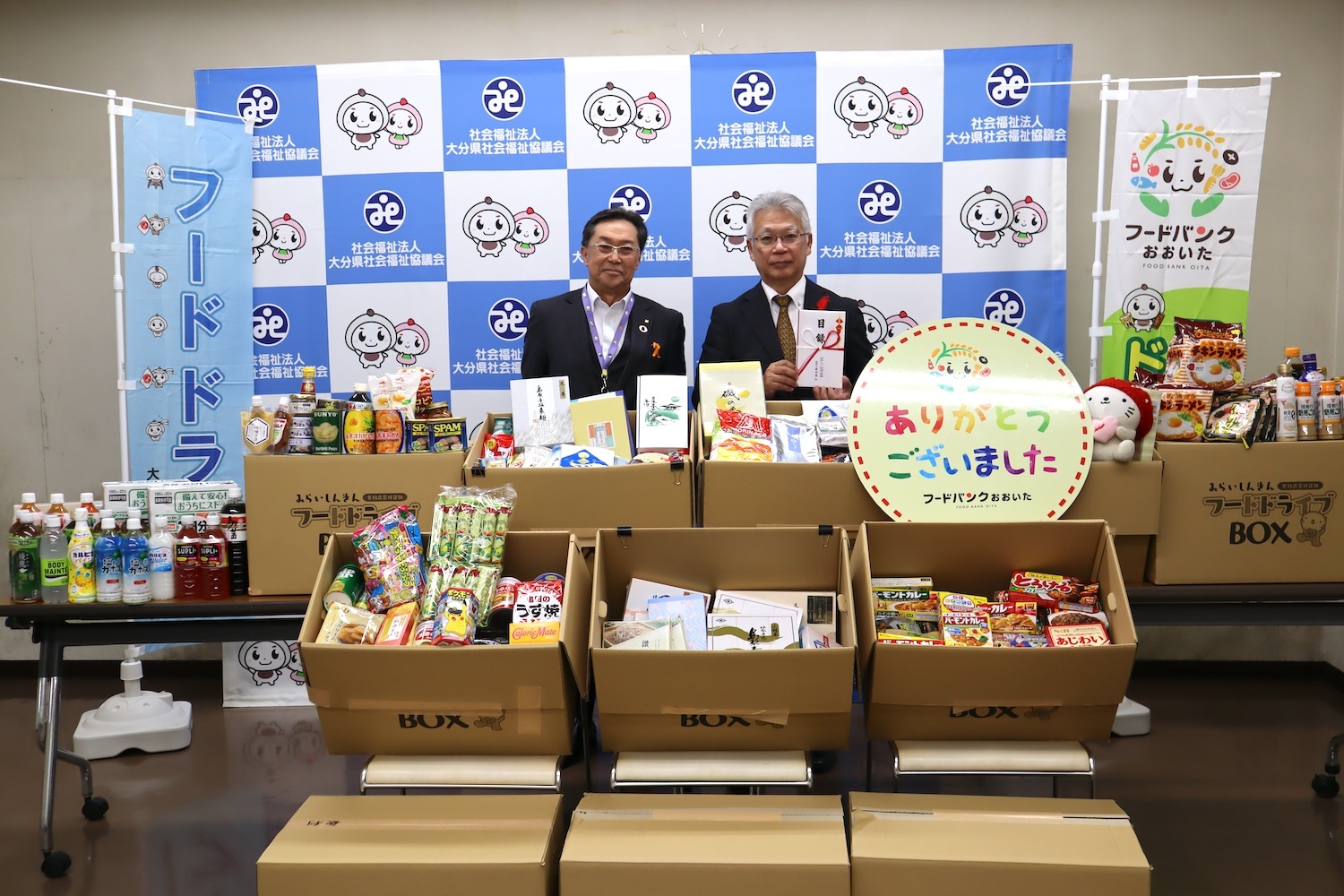 フードドライブで集まった食品に加えて、大分県社会福祉協議会『愛のたすけあい』善意銀行を通じて、当金庫営業エリア6市1町の子ども食堂へ100万円の現金寄附をいたしました。