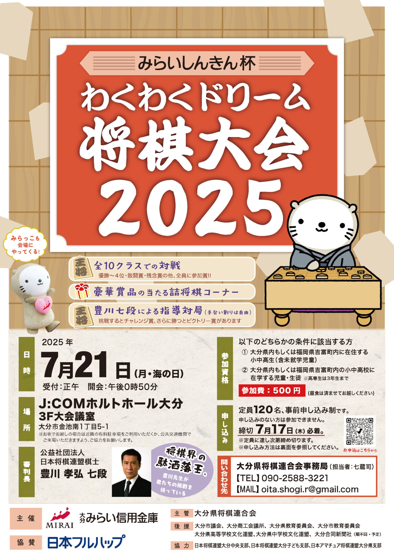 大分みらい信用金庫(理事長 森田 展弘)では、地域を担う子供たちの健全育成と地域の健全な発展に資することを目的とした「みらいこどもスクール」事業として、本年度で9回目となる「みらいしんきん杯わくわくドリーム将棋大会2025」を開催します。是非ご参加ください。
