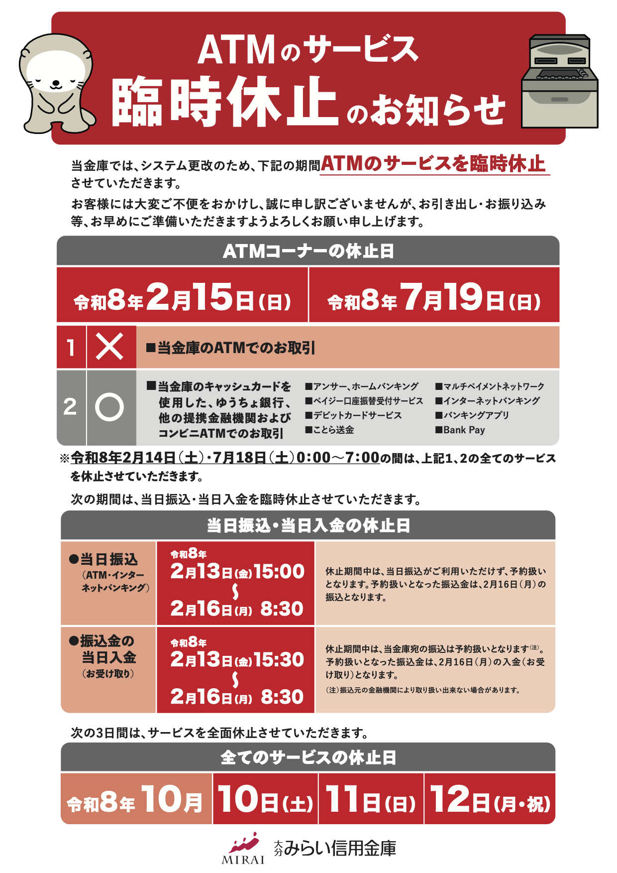 お知らせ 2026年01月05日 ATMのサービス 臨時休止のお知らせ 平素は、大分みらい信用金庫をご愛顧いただき、誠にありがとうございます。 この度、システム更改のため、以下の期間ATMのサービスを臨時休止させていただきます。 お客さまには大変ご不便をおかけいたしますが、何卒ご理解を賜りますようお願い申し上げます。