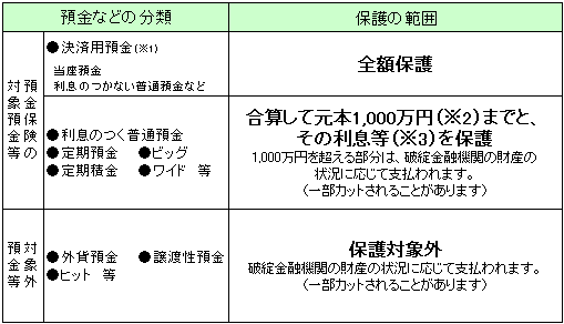 (※2)当分の間、金融機関が合併したり、営業(事業)の全てを譲り受けた場合には、その後1年間に限り当該保護金額が1,000万円の代わりに、「1,000万円×合併等に関わった金融機関の数」による金額となります。(例えば、2行合併の場合は2,000万円)