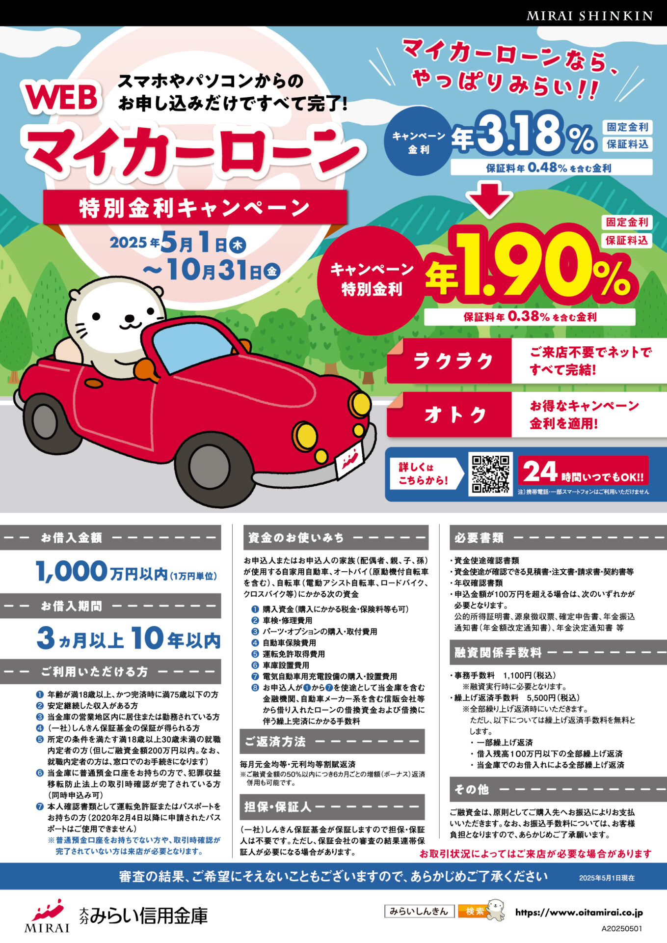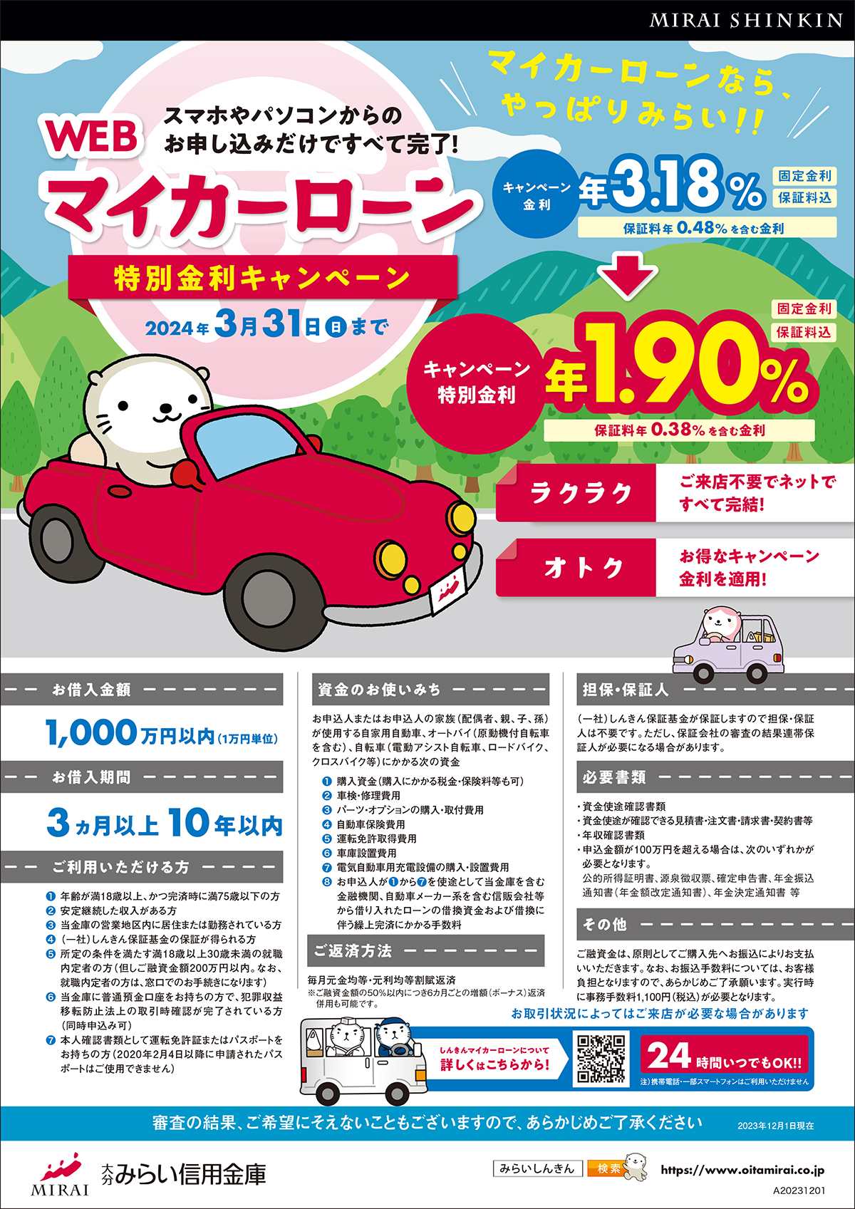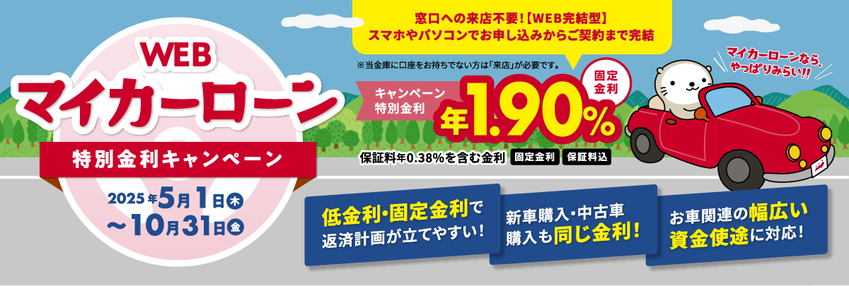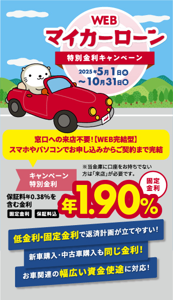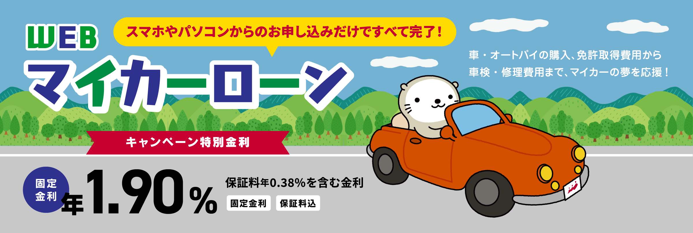 WEBマイカーローンは、低金利で申込手続きも簡単!100万円以下のお申込みは収入証明も不要です。また金利は固定金利、借入期間は最長10年まで利用できて返済計画が立てやすいです。