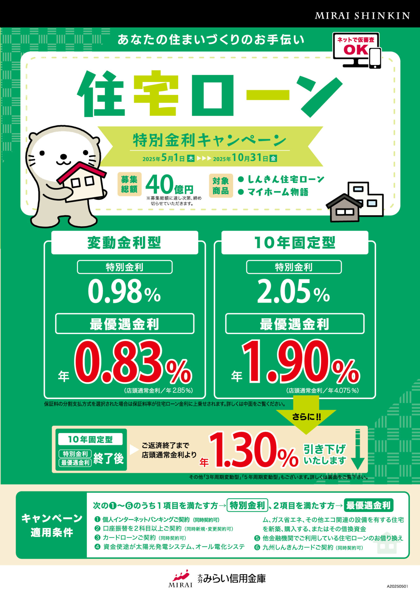- 3周期変動型および5年周期変動型をご選択の場合、手数料5,500円(消費税込)が必要です。(お借入金残高が300万円以下の場合、手数料は無料です)
