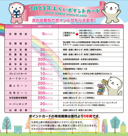 - 有効期限内であっても「みらいポイントカード」のサービス内容が変更となる場合がございますのであらかじめご了承ください。